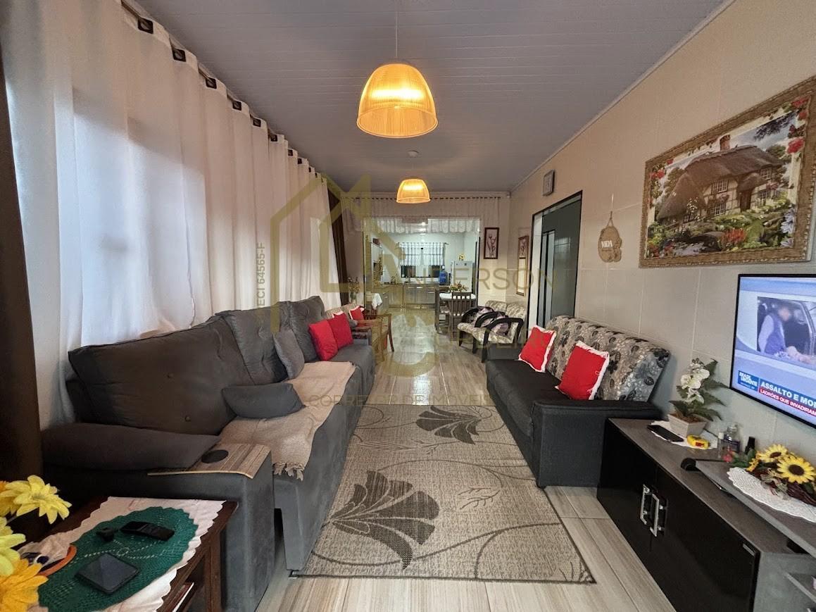 Imóvel residencial com excelente distribuição de espaços, composto por três dormitórios sendo um deles suíte, sala de estar e sala de jantar integradas, cozinha funcional e bem ventilada, além de um banheiro social. Na área externa, possui garagem coberta para dois carros, churrasqueira para momentos de lazer e pátio na frente.